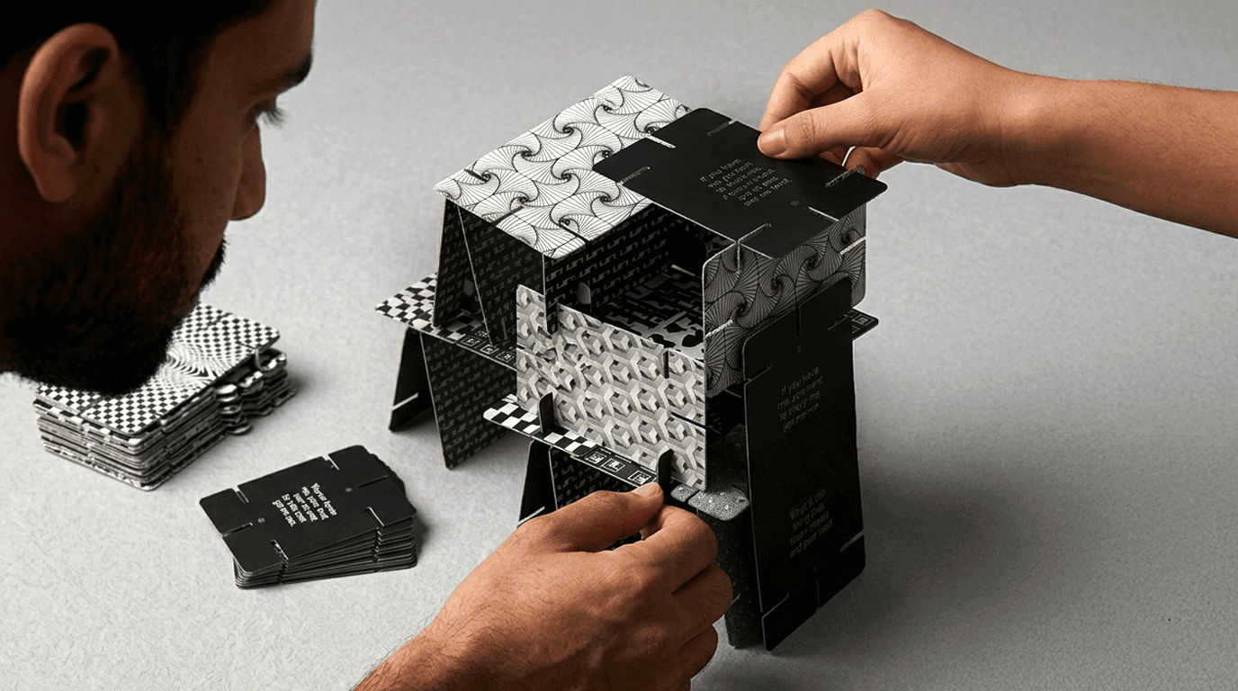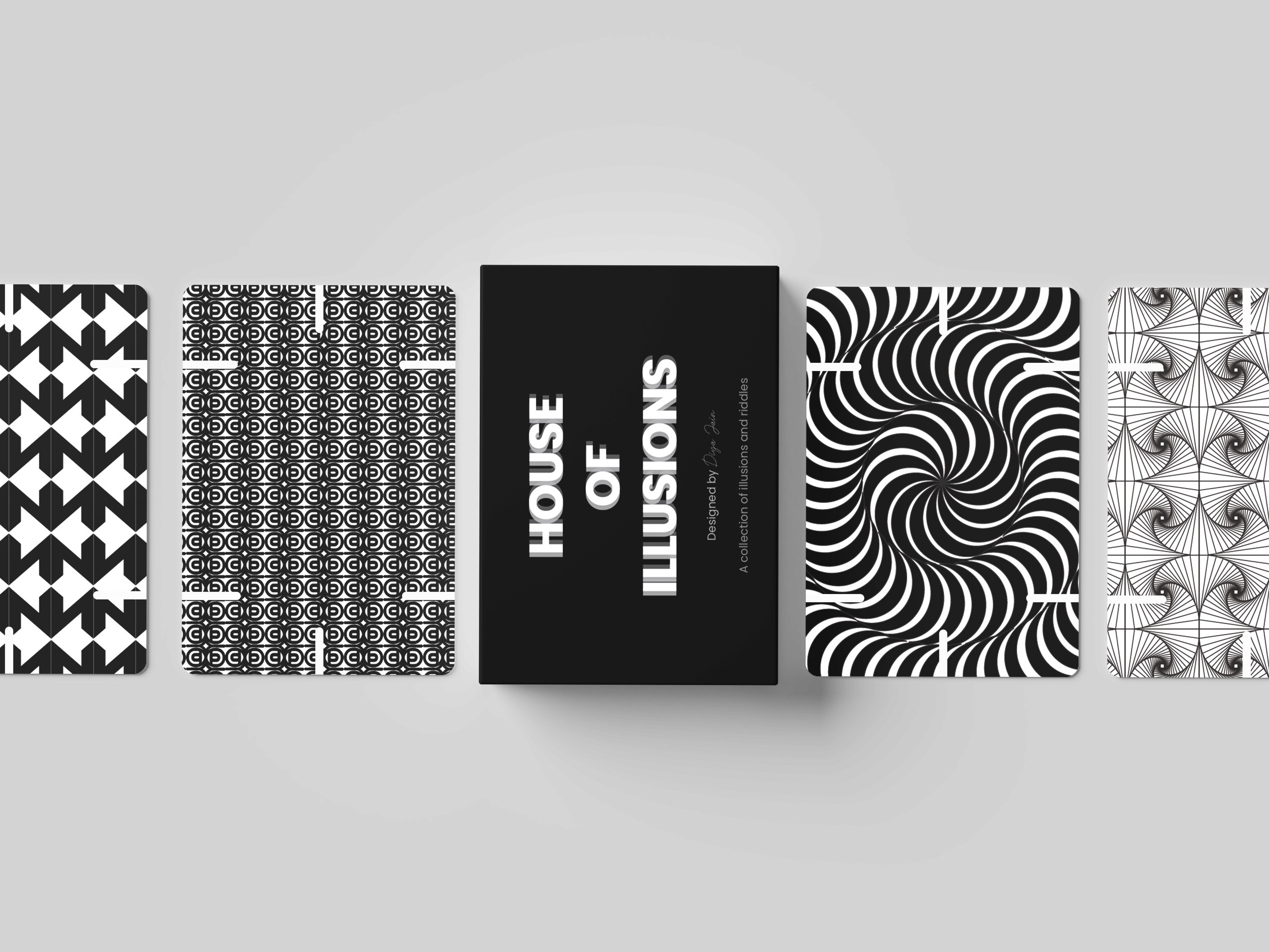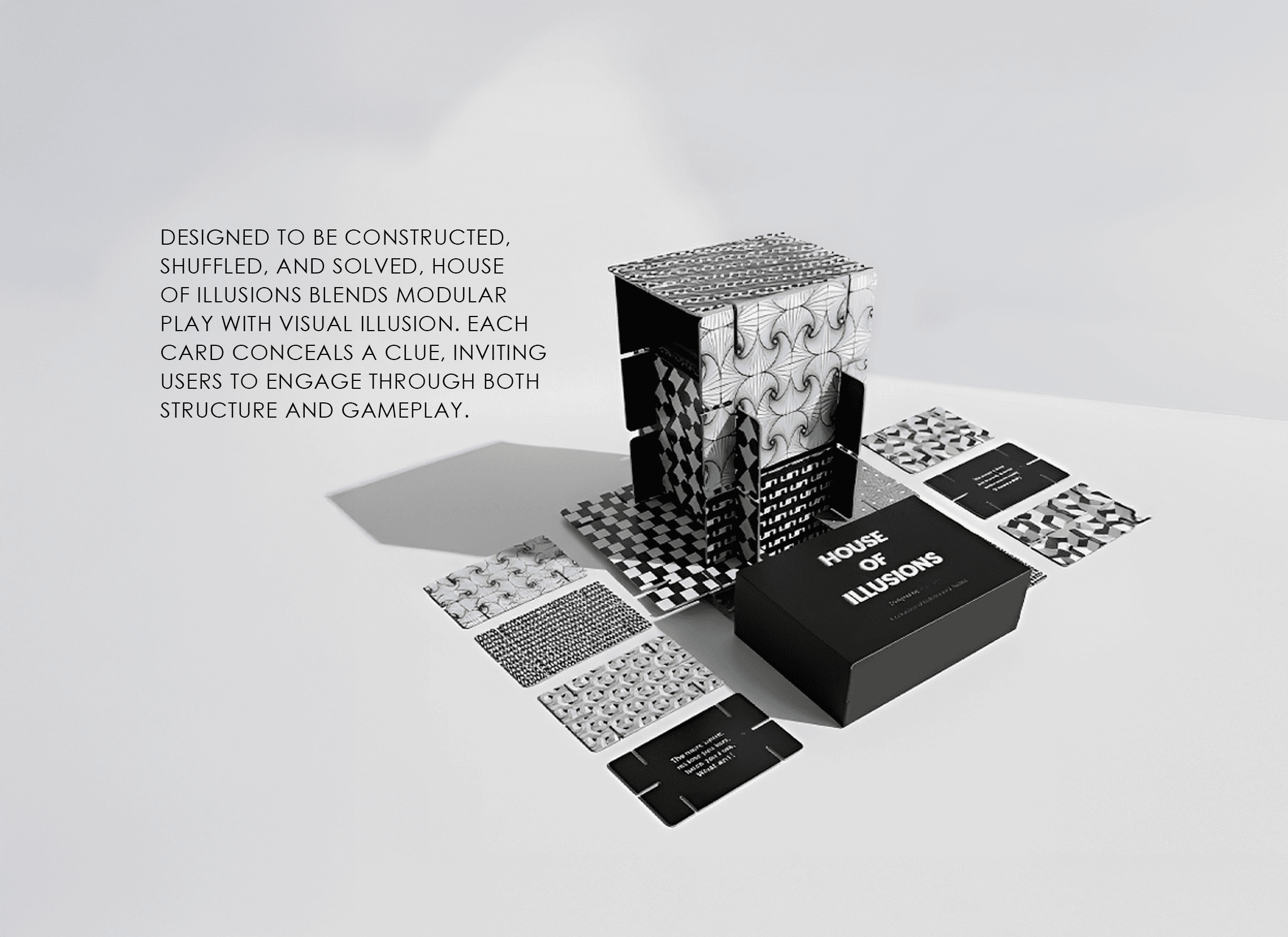 House of Illusions is a conceptual card system centred around visual illusion, perception, and modular play. I developed the project as an experimental reinterpretation of a card-based structure, transforming it into a puzzle-driven graphic experience. Each of the 20 cards presents a carefully constructed illusion on the front and a riddle on the back, with a hidden letter embedded within the artwork as a clue. The deck turns illusion into interaction, encouraging discovery, engagement, and structured play through design.